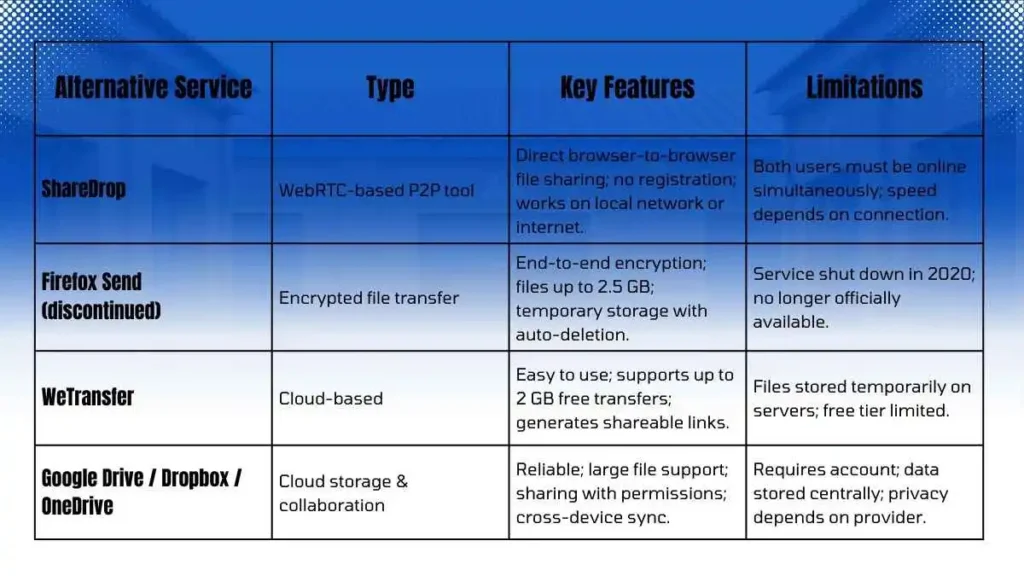 - Dependence on Open Browsers: Both parties had to keep their browsers open for the duration of the transfer, which could be impractical for larger files.